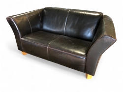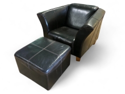 Mörkbrun. Bredd 107, djup 88, sittbredd 55, sittdjup ca 54, sitthöjd 40cm. Fotpall 58x58, h.40cm