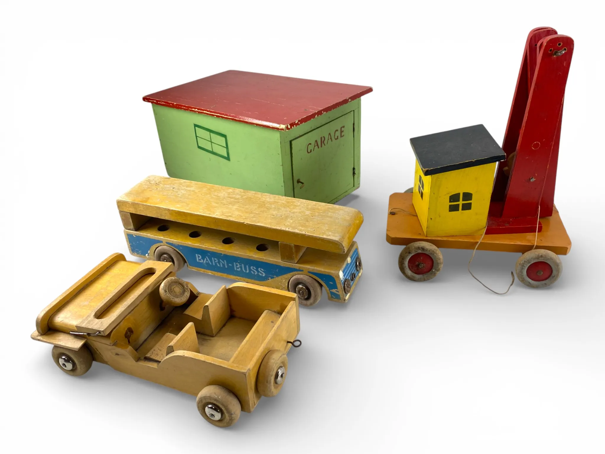 92. Äldre leksaksbilar i trä, BRIO garage mm