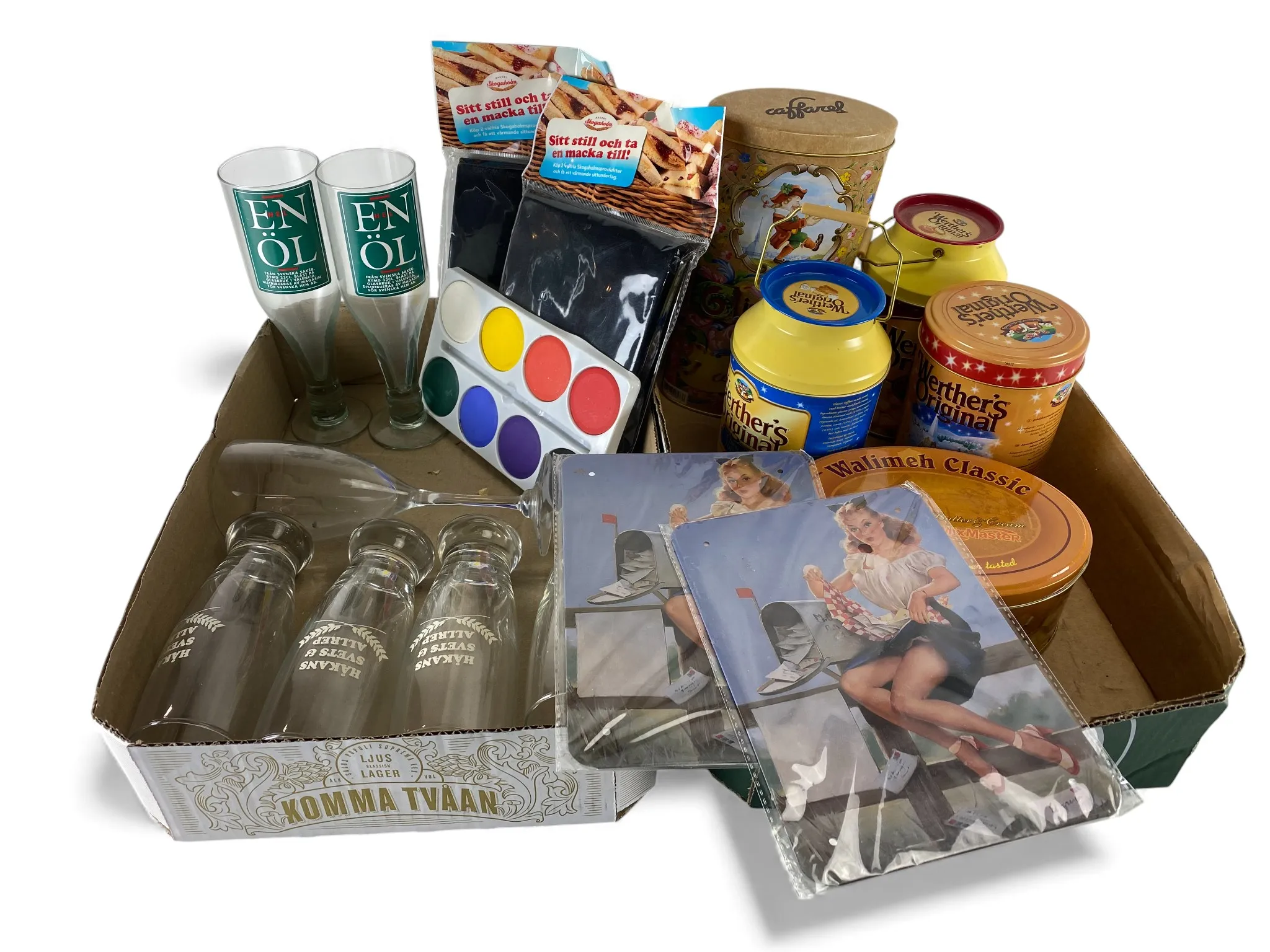 19. Ölglas, plåtburkar, 2 sittunderlag och 2 plåtskyltar