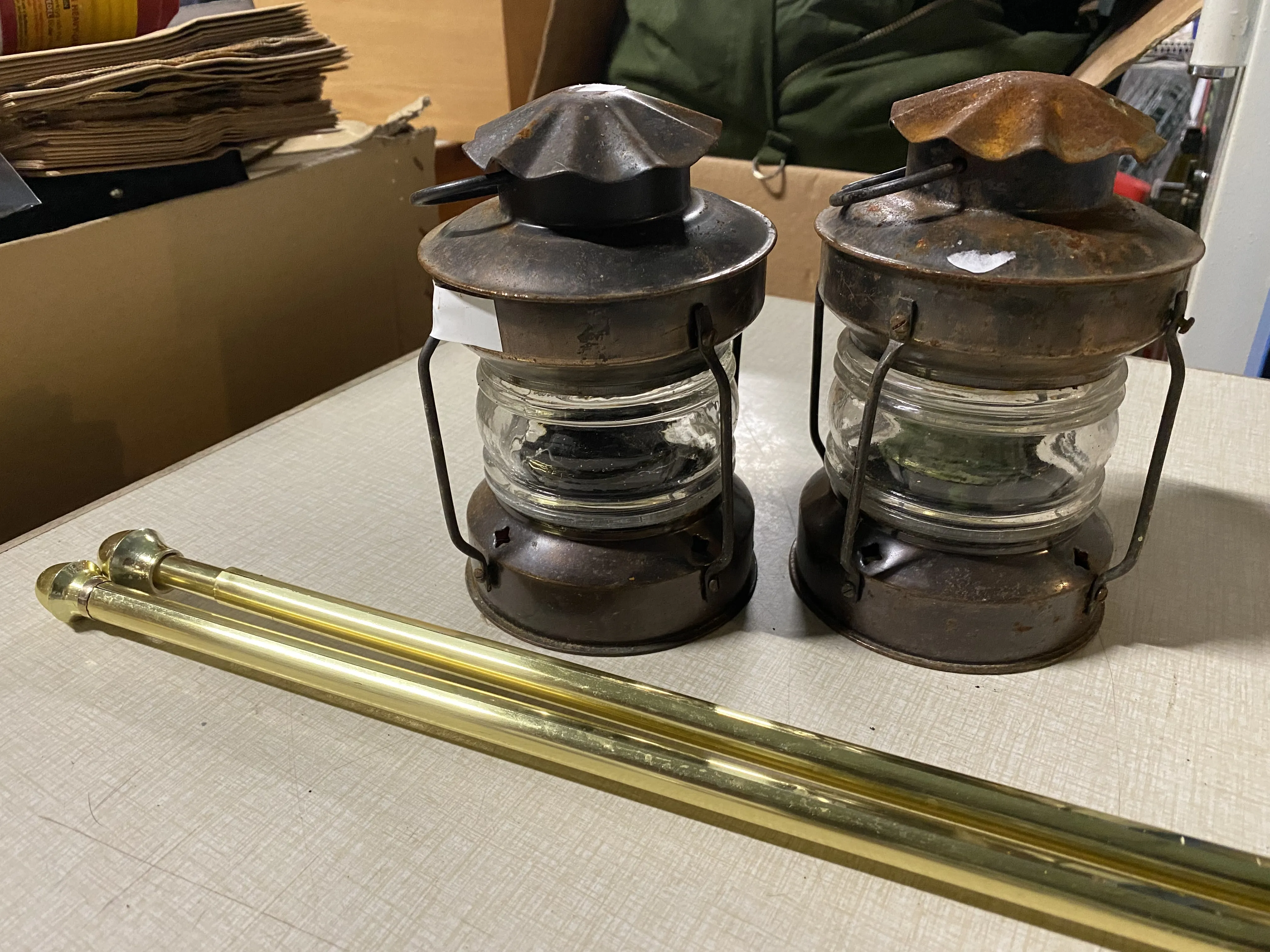82. 1 Par lyktor, metall/glas och 2 smala gardinstänger, gul metall
