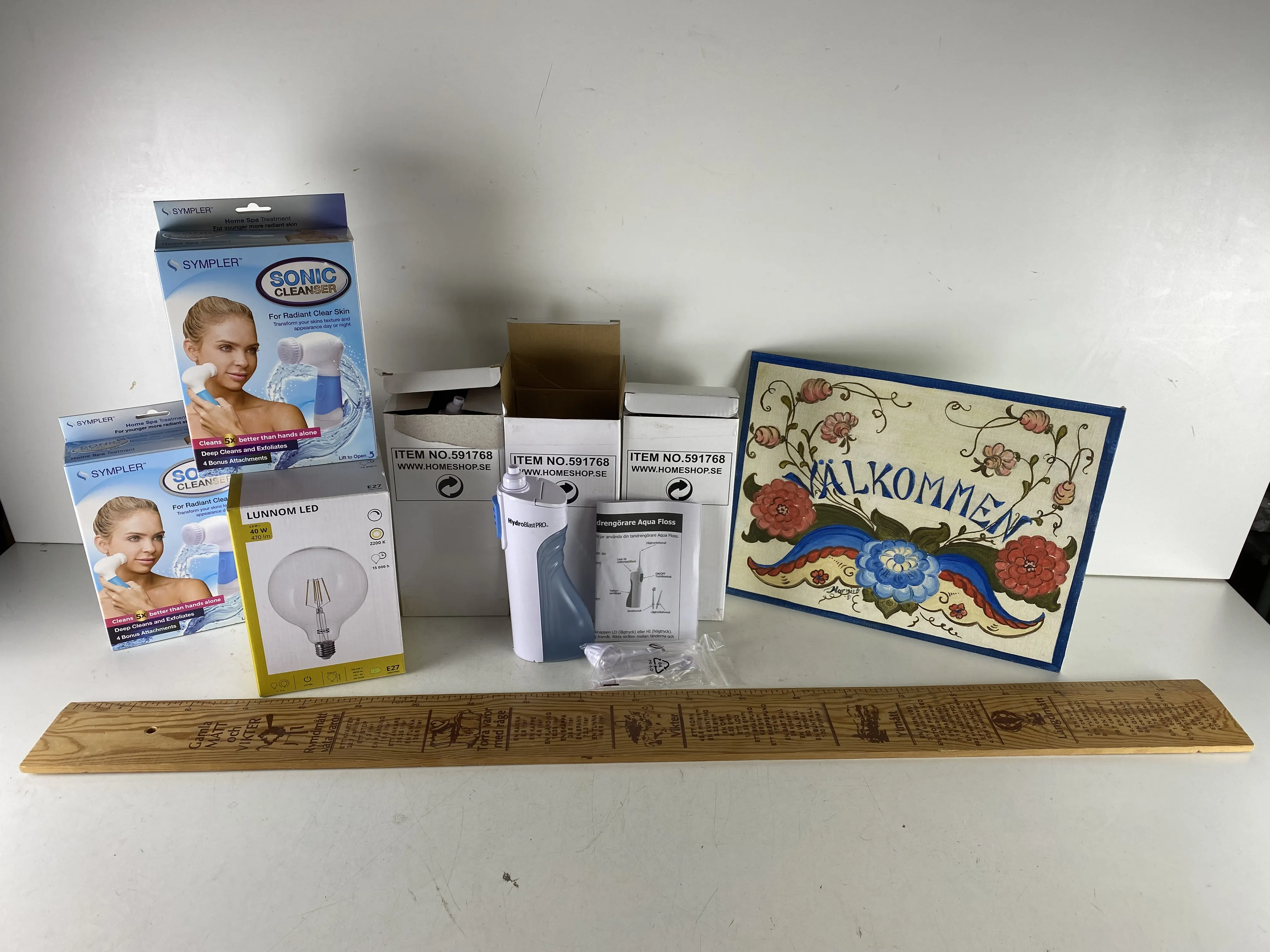 254. 2 Ansiktsrengörare, 3 tandrengörare, glödlampa, vägglinjal och välkommenskylt