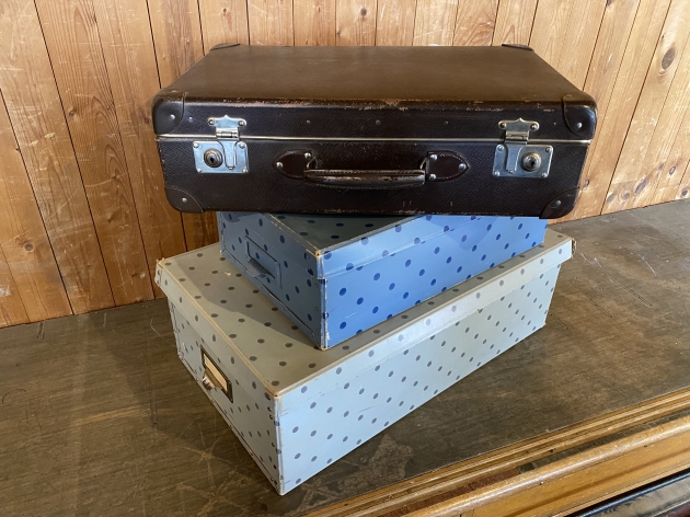 171. 2 Förvaringslådor och äldre resväska, papp