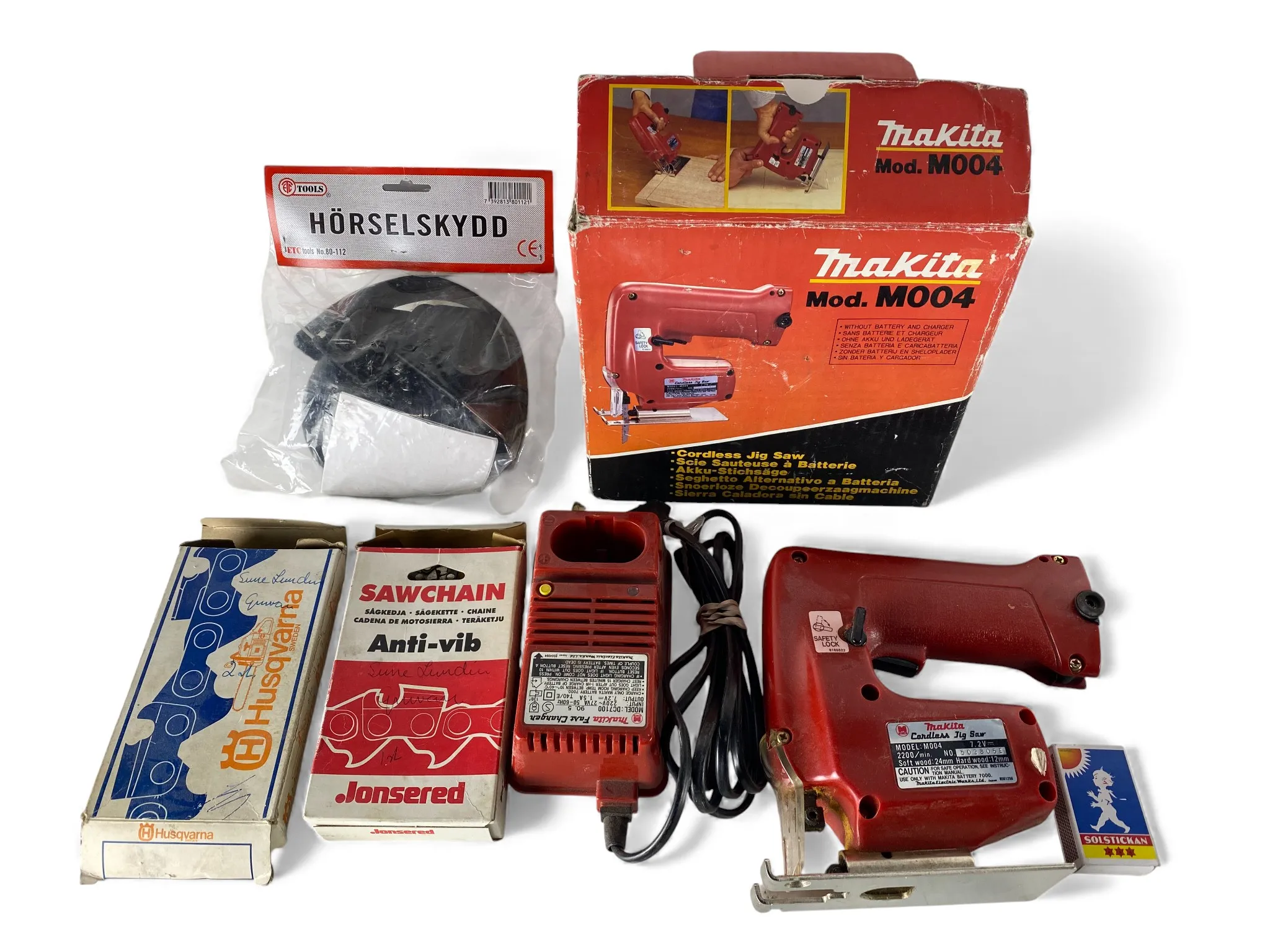34. 2 Motorsågskedjor, hörselskydd och MAKITA sticksåg (batteri saknas)