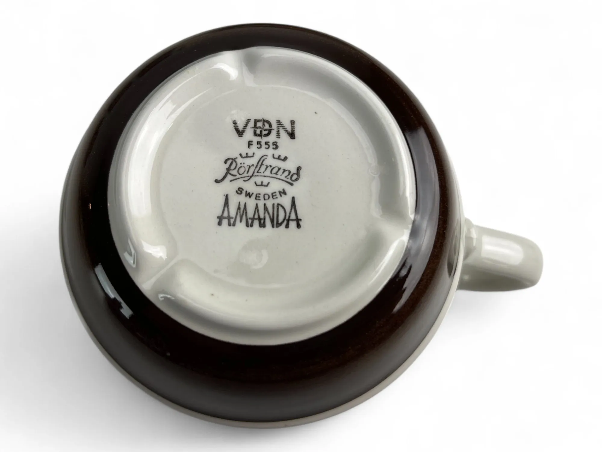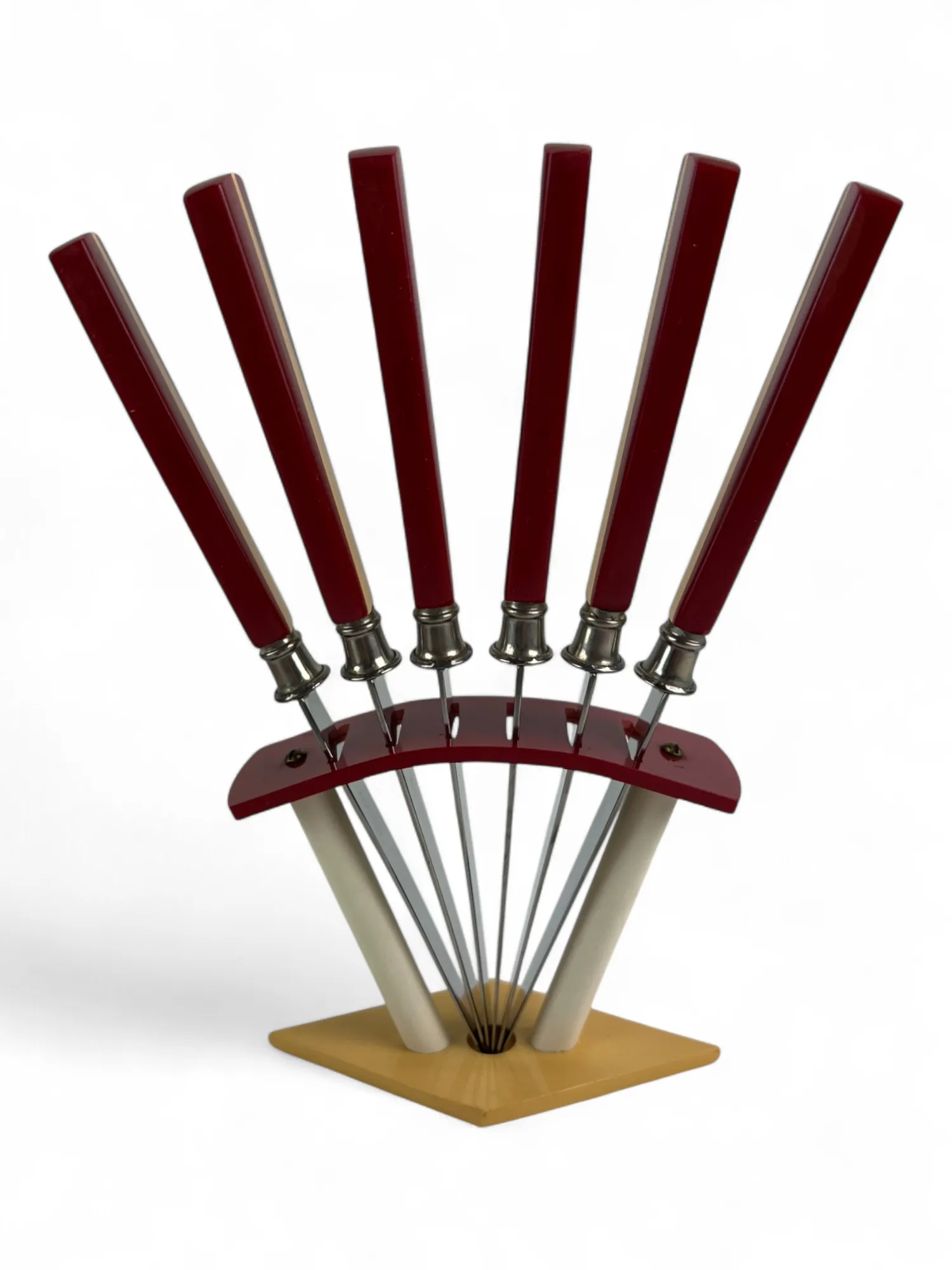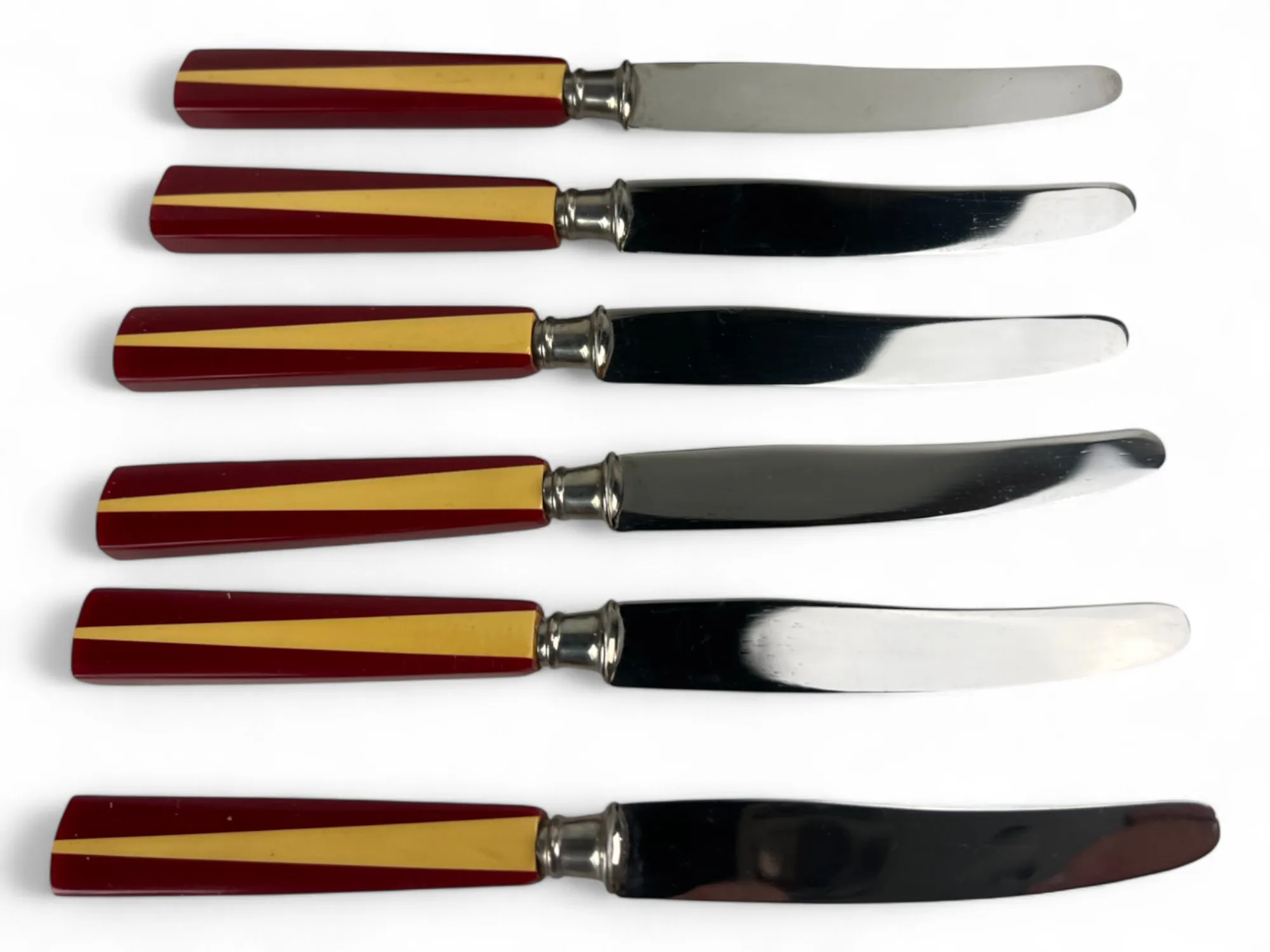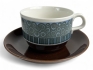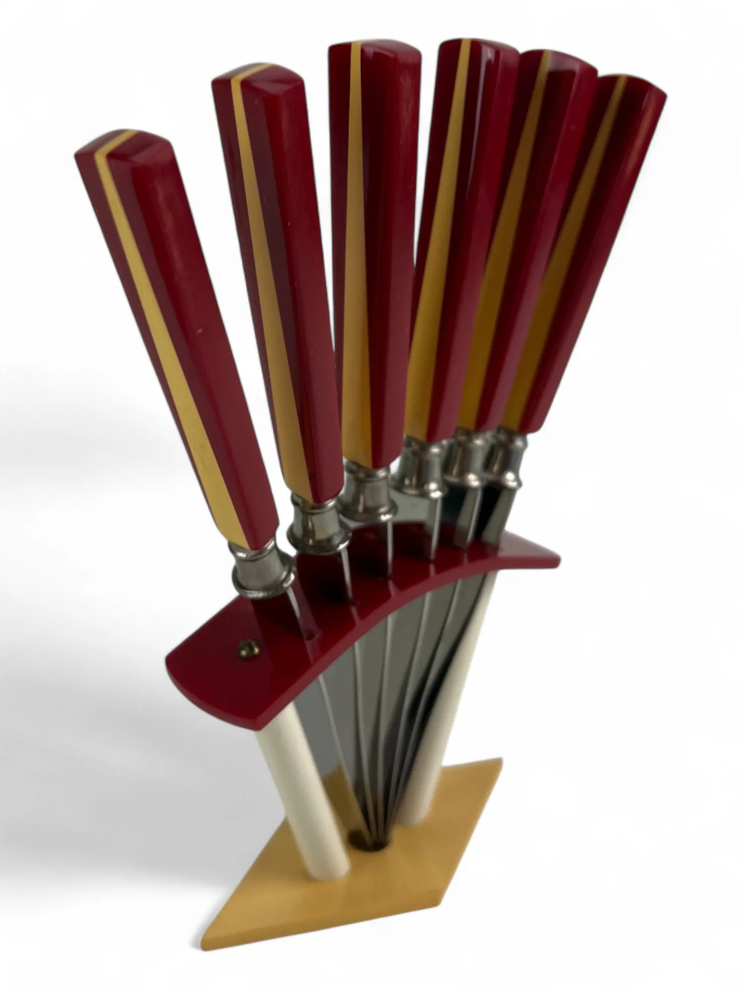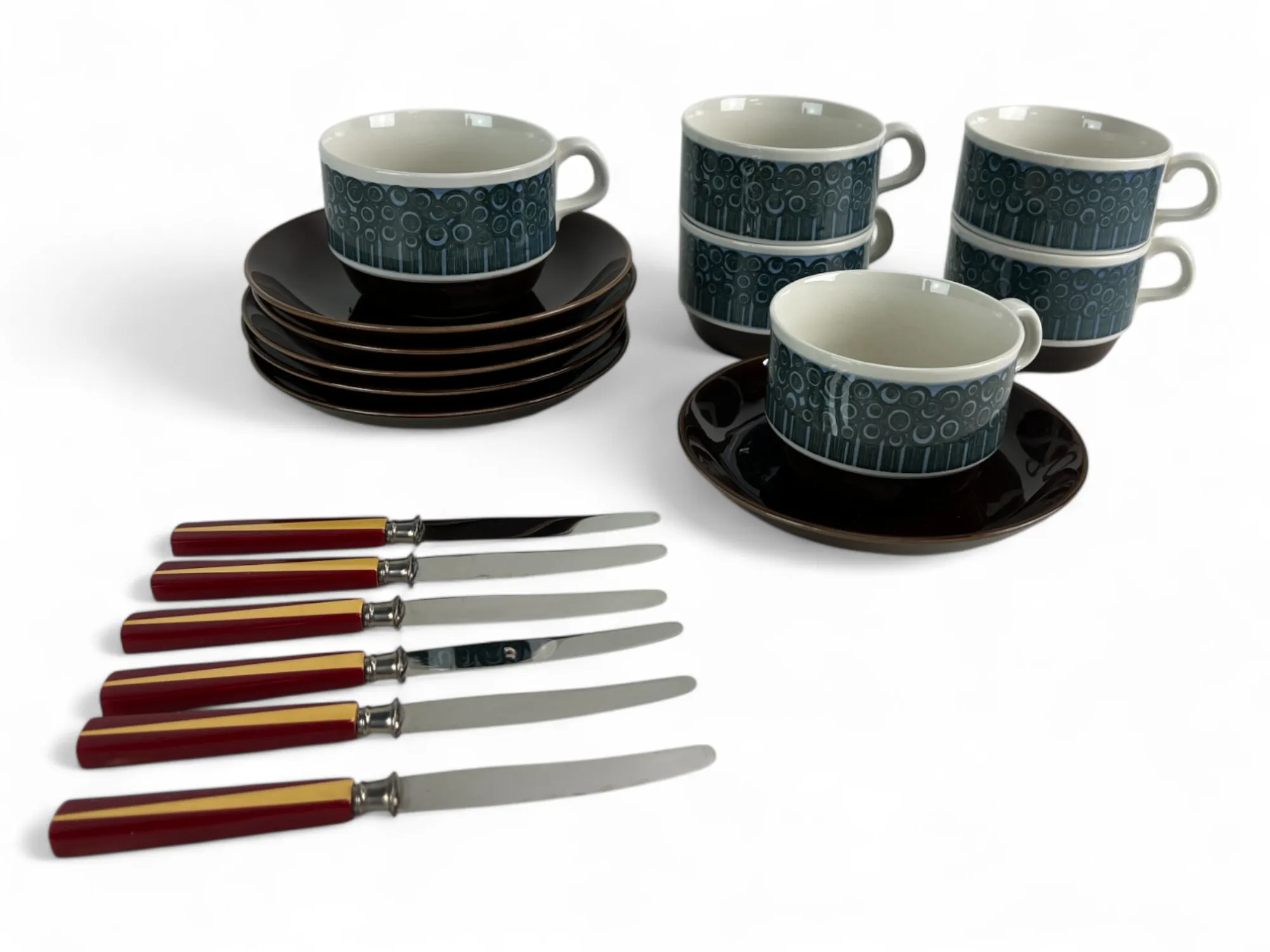264. 6 st Tekoppar med fat, RÖRSTRAND "AMANDA" samt knivar retro i ställ se bild