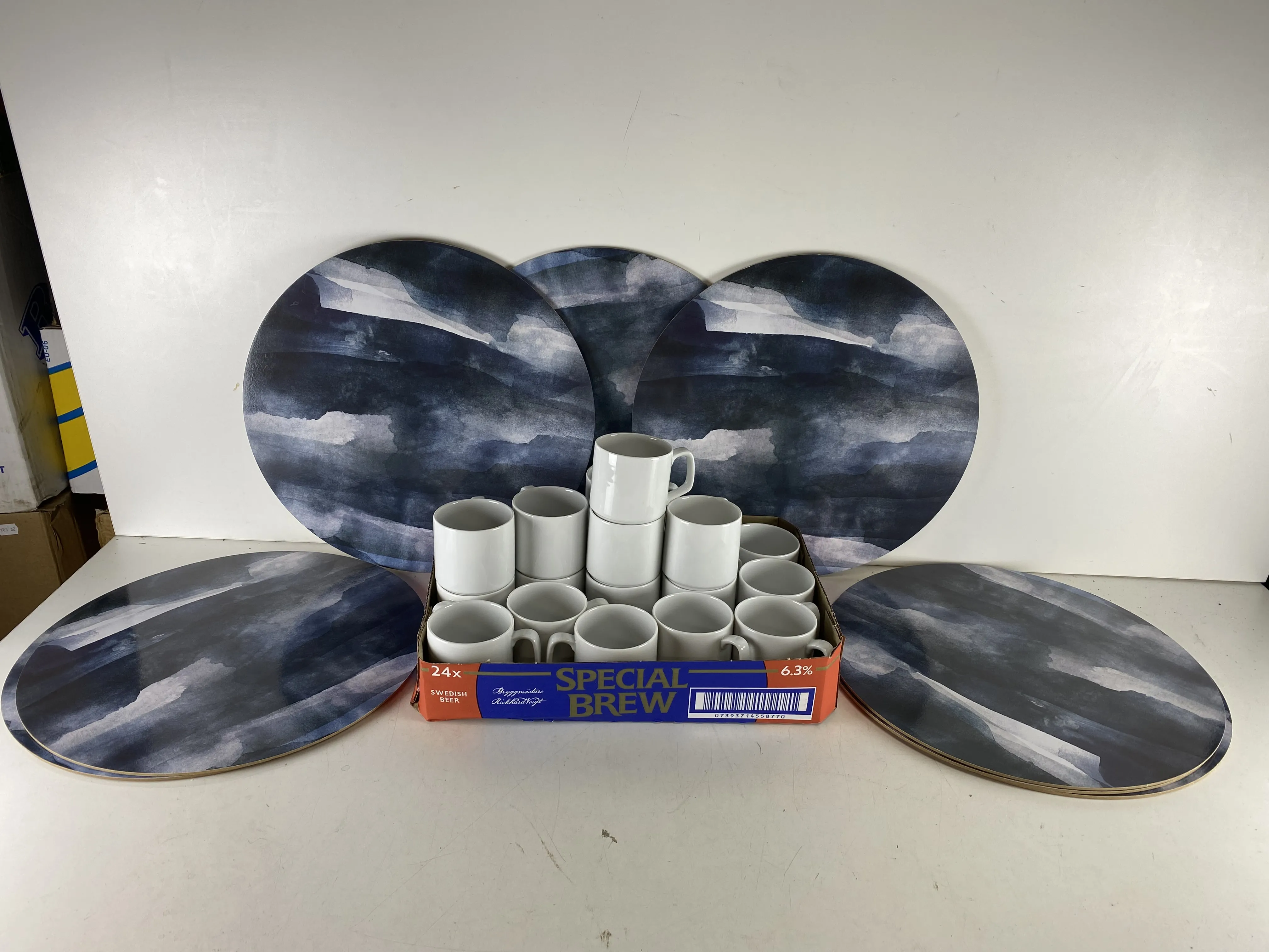 1. 8 Bordstabletter, fiberboard/kork och 21 muggar, porslin
