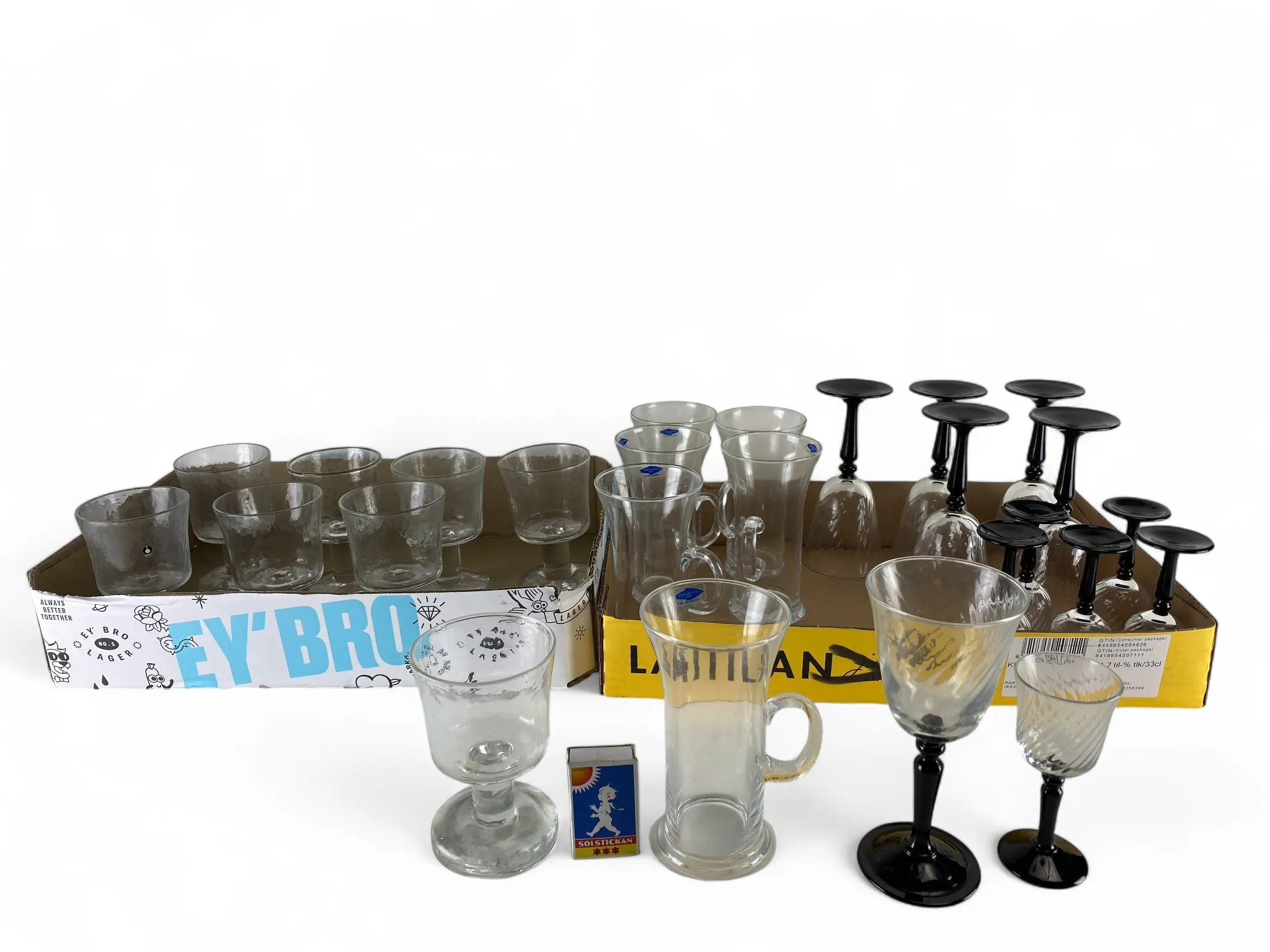 148. 8 Glas PUKEBERG, 6 Irish coffee glas NUUTAJÄRVI, 6 snapsglas och 6 vinglas med svart fot