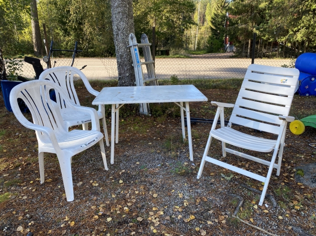 154. Bord och 3 plast stolar