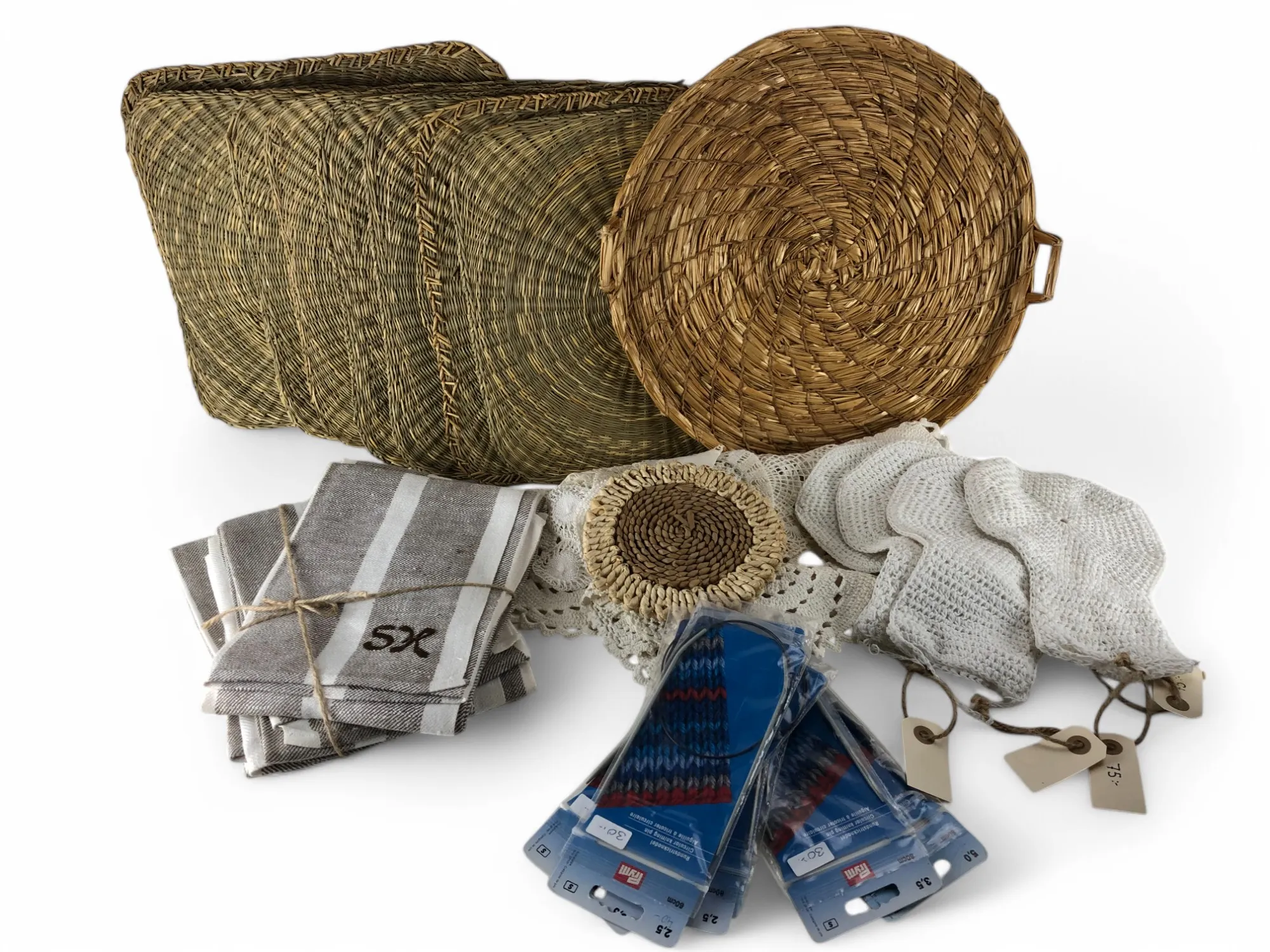 424. Bordstabletter, 6 linnehanddukar, dukar och rundstickor