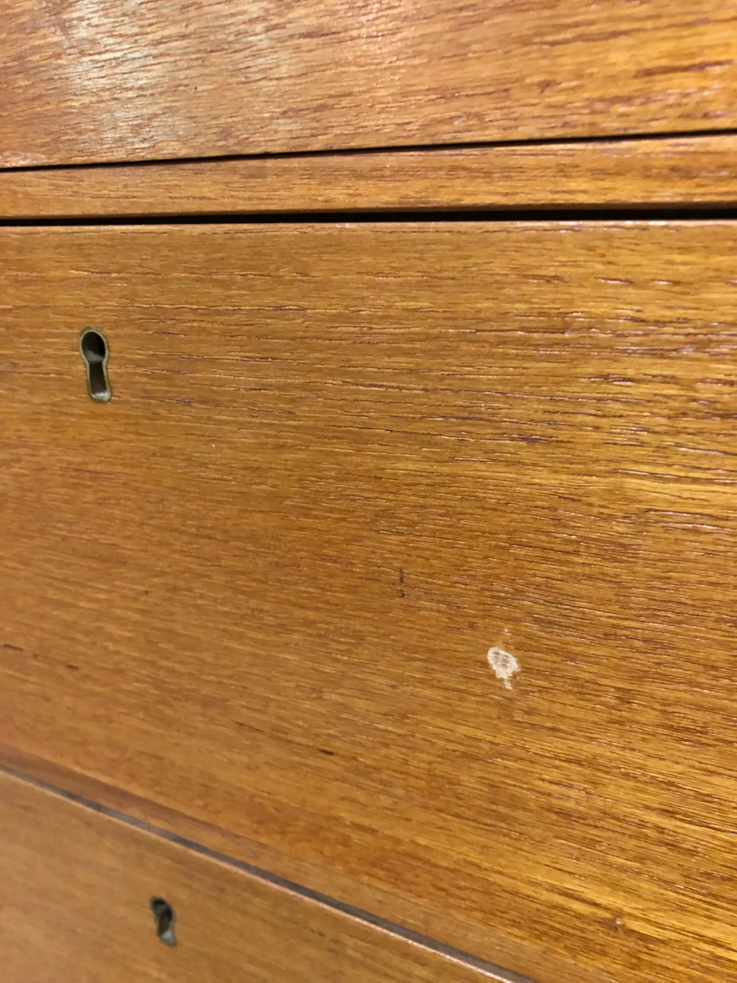 B75, d37.5, h.86cm. Fint skick men har några mörka fläckar på toppskivan och litet märke på en lådfront. Ingen nyckel finns, men olåst