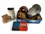 59. Cigarrlådor, metallkärl med kran, kopparformar, kakform med lock och skidbindningar EVERFIX