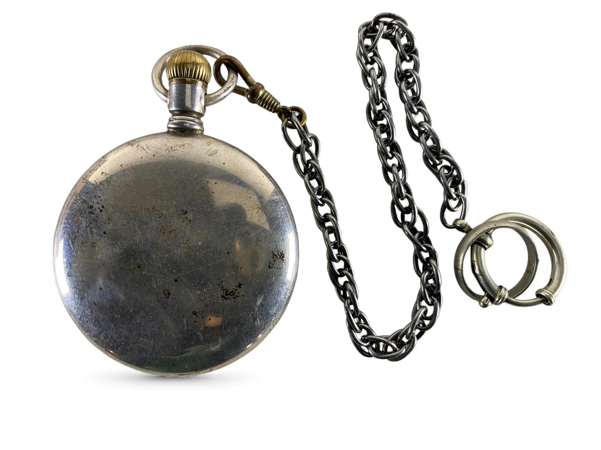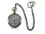 Urtavla dia. 43mm, boett dia. 53mm. Kedja ej silver. Lite repor och krackeleringar i glaset. Går ej igång