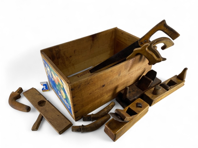 45. Fraktlåda med 4 trähyvlar, 4 sågar och träskaft/handtag