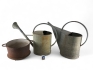 216. Gjutjärnsgryta/kruka med dräneringshål i botten och 2 zinkkannor