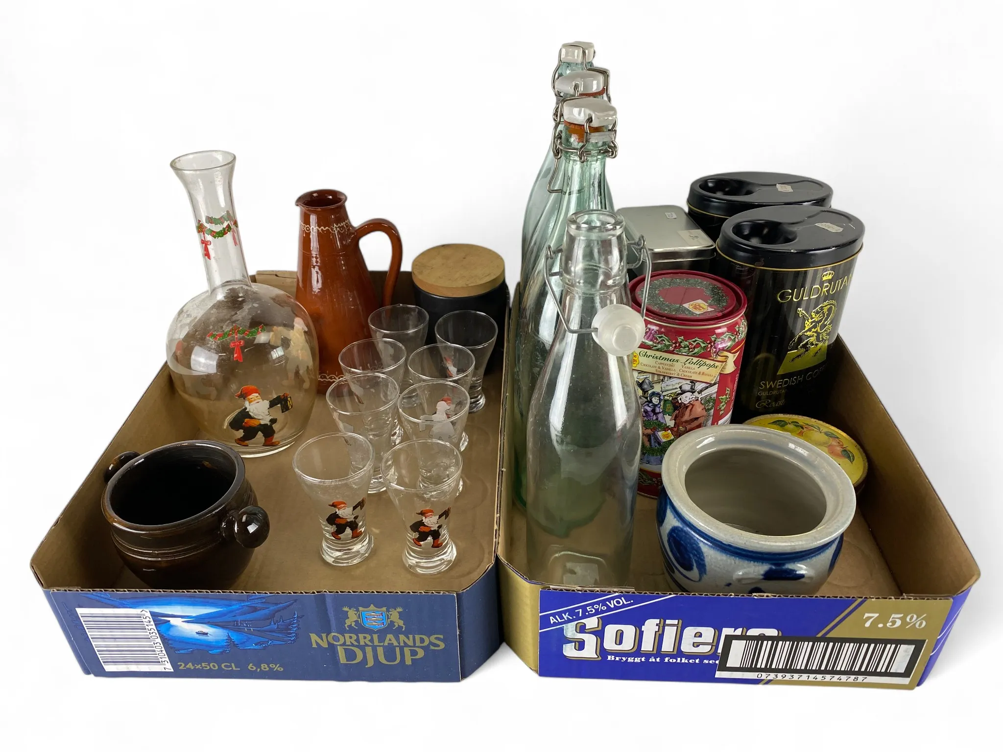 186. Julkaraff med 8 snapsglas, flaskor, plåtburkar mm