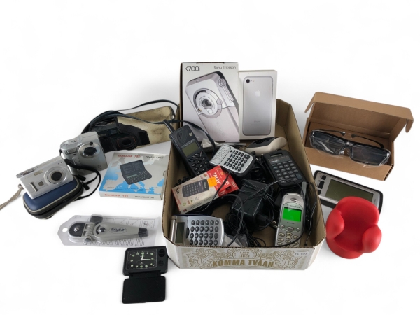 281. Kameror, telefoner bl a Iphone 7, miniräknare mm.