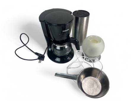 347. Knivblock, kaffebryggre PHILIPS mindre, aromalampa med trasig men användbar behållare