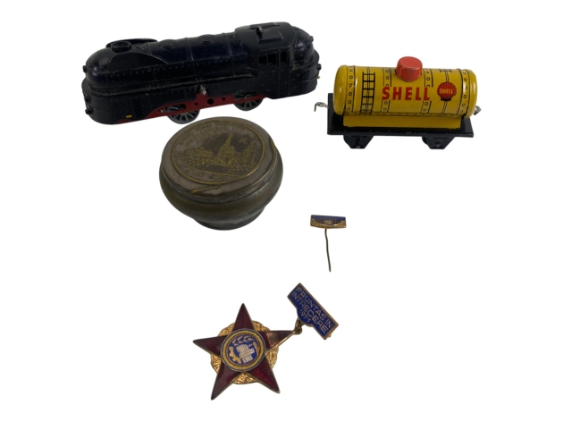 91. Leksakståg, plåt, Minne från Västerås utsällningen 1929, samt komunistmärken