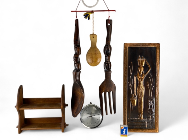 131. Liten kryddhylla, stora köksredskap i trä, hår-hygrometer och koppartavla