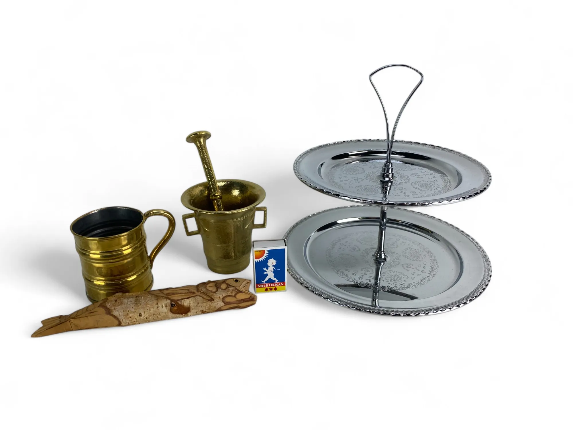 138. Mortel, kopp i mässing, fisk i trä, kakfat