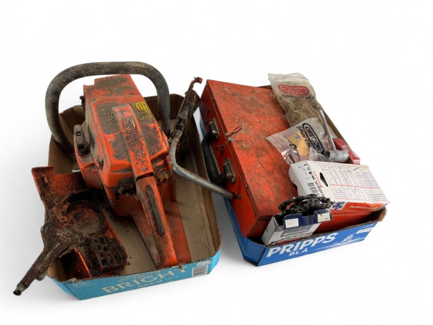 338. MOTORSÅG i delar, ej komplett, reservdelsmaskin, samt reservdelar till sågar mm