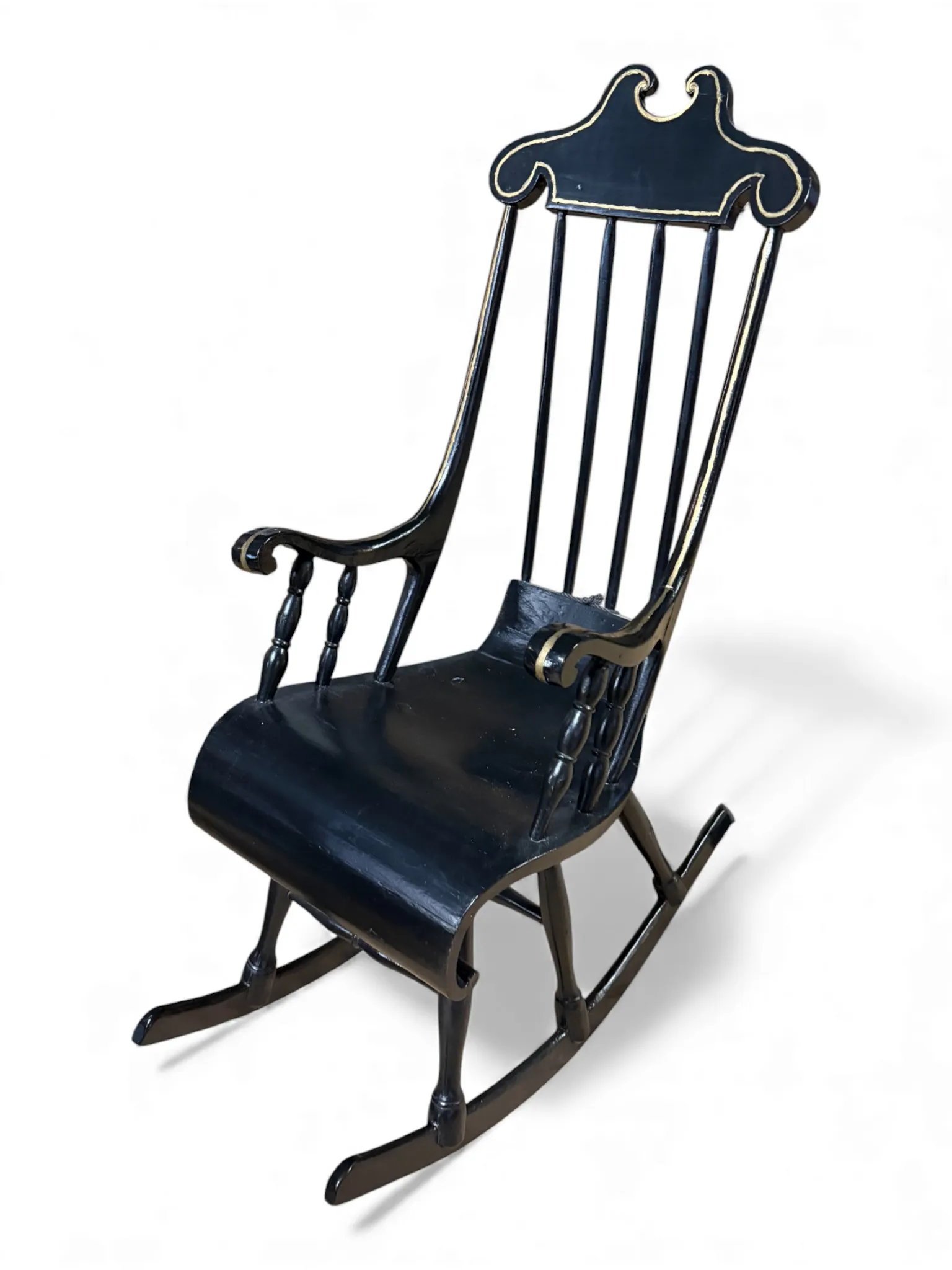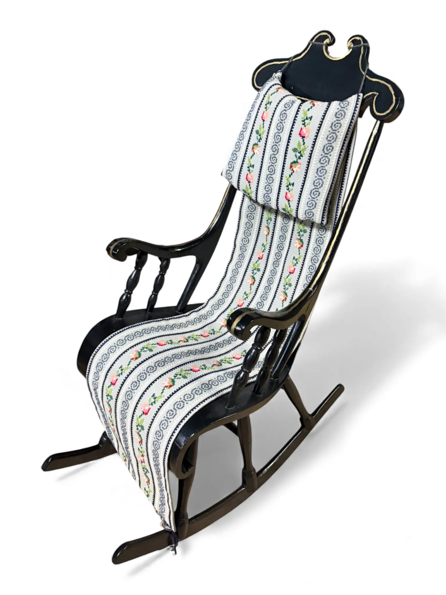 208. Nätt gungstol, målad i svart/guld, med klädsel