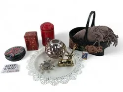 62. Plåtburkar, plåtbricka, korg, filt mm