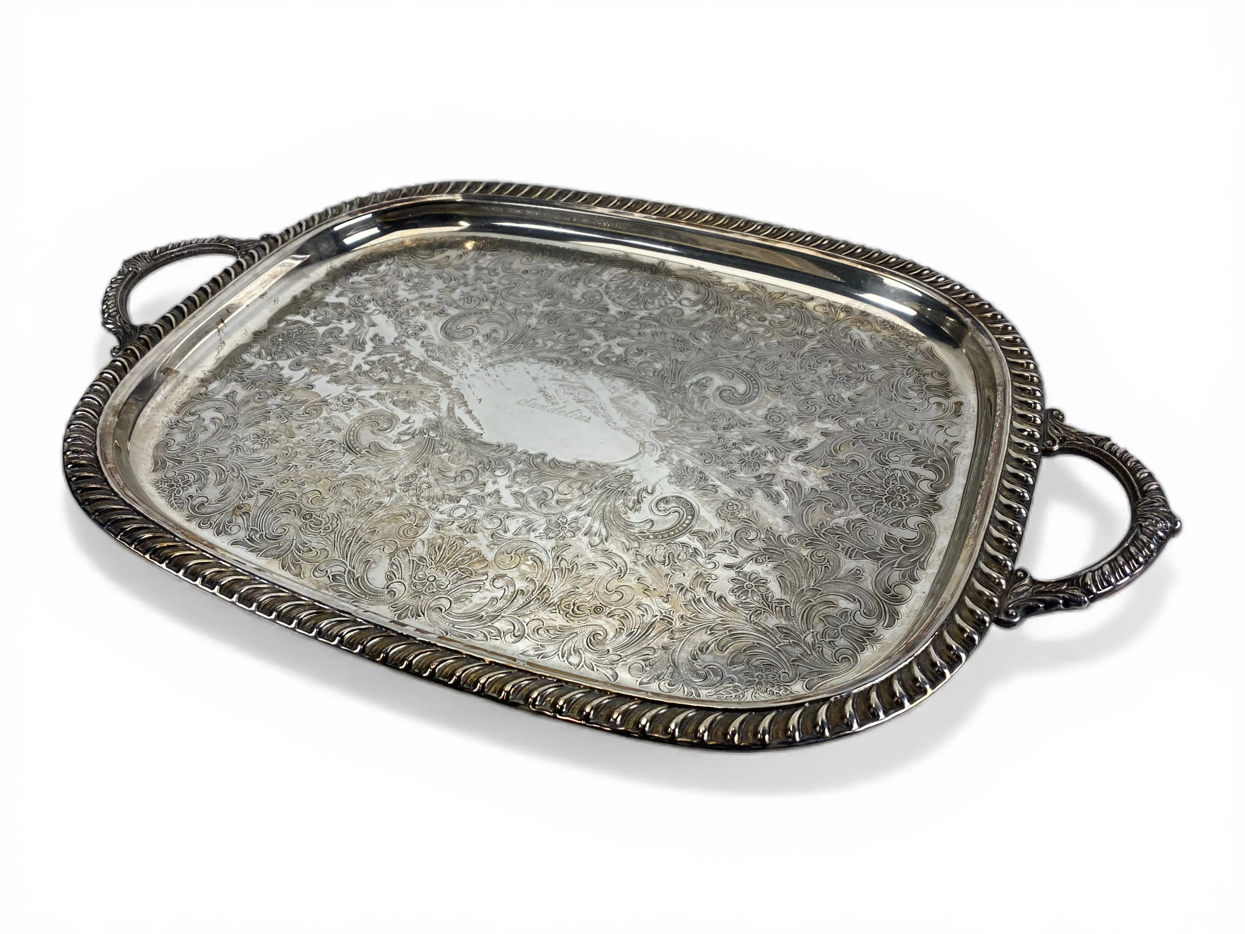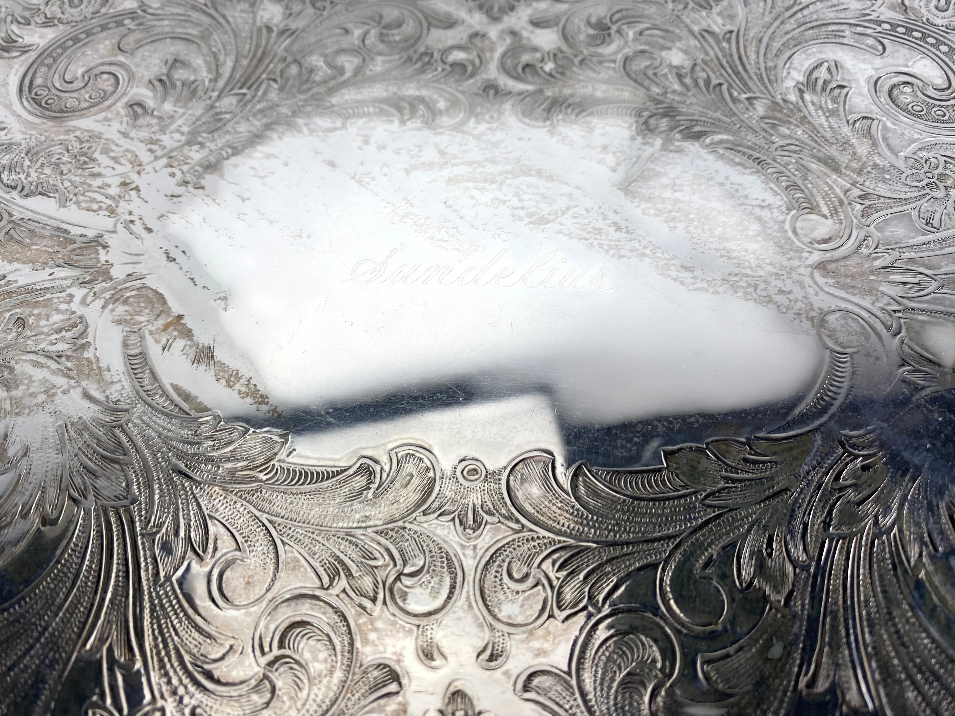 59. Serveringsbricka på fötter, gravyr med namnet "Sundelius" på ovansida, 35x55cm