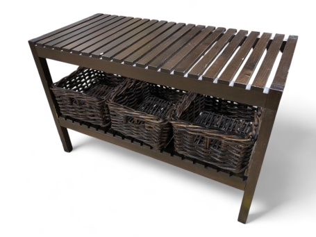 283. Sko-/förvaringshylla med korgar, brunbetsad