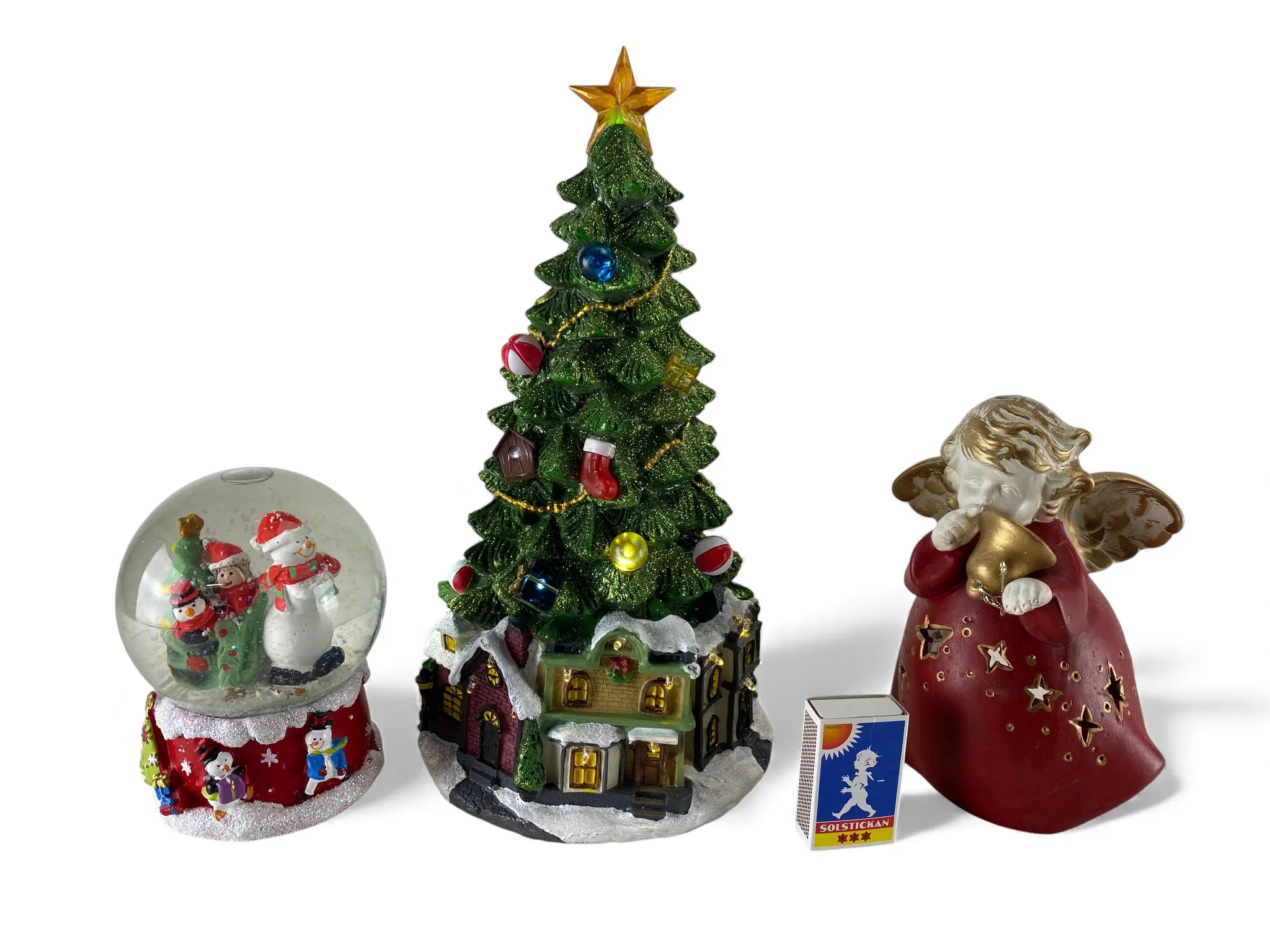 118. Snöglob med speldosa, juldekoration med belysning och ljuslykta ängel