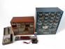 77. Sortimenthyllor, äldre multimetrar och testsladdar till multimeter