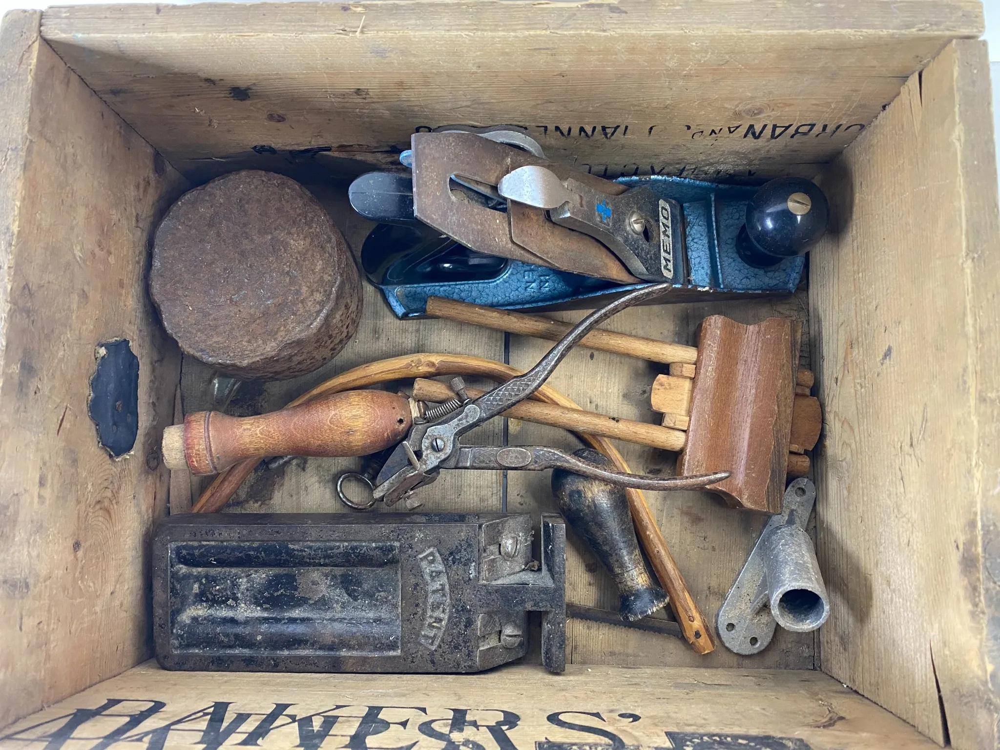 59. Trälåda med smått och gott, 7 par gummihandskar strl 11 och pappersrullehållare
