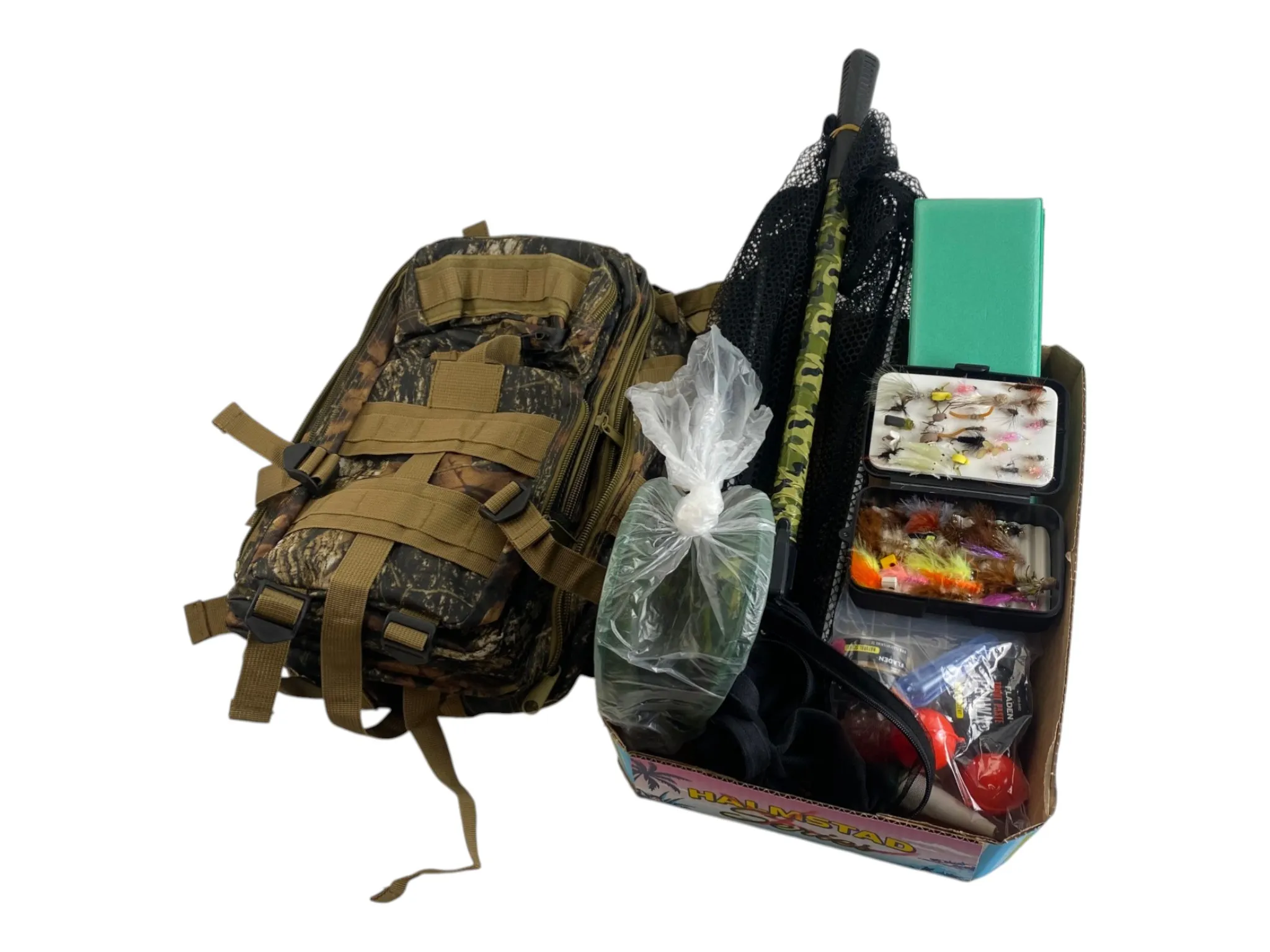17. Väska, fiskelåda, håv, flugor mm